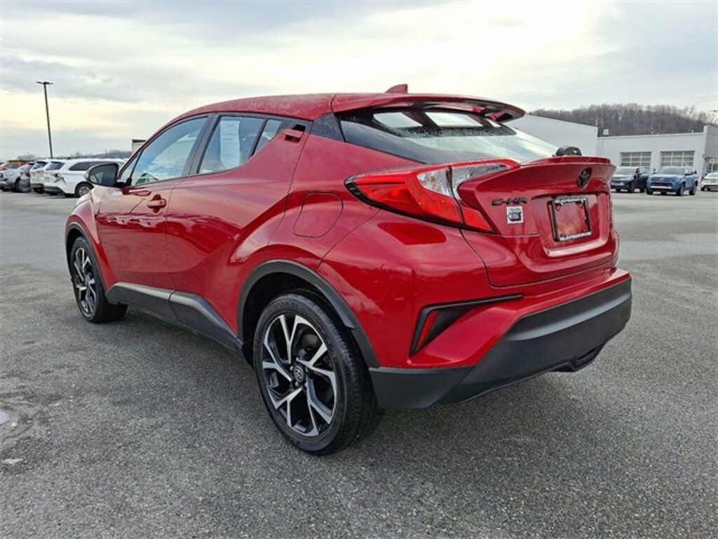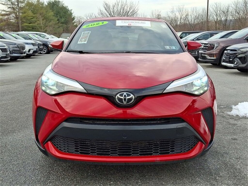 Here is a list of the vehicles features C-HR XLE, Toyota Gold Certified Certified, 4D Sport Utility, 2.0L I4 DOHC 16V, CVT, FWD, Supersonic Red, Black w/Blue w/Fabric Seat Material, 4-Wheel Disc Brakes, 6 Speakers, ABS brakes, Air Conditioning, Alloy wheels, AM/FM radio: SiriusXM, Auto High-beam Headlights, Auto-dimming Rear-View mirror, Automatic temperature control, Axle Ratio: TBD, Brake assist, Bumpers: body-color, Delay-off headlights, Driver door bin, Driver vanity mirror, Dual front impact airbags, Dual front side impact airbags, Electronic Stability Control, Emergency communication system: Safety Connect with 1-year trial, Exterior Parking Camera Rear, Fabric Seat Material, Four wheel independent suspension, Front anti-roll bar, Front Bucket Seats, Front Center Armrest, Front dual zone A/C, Front reading lights, Fully automatic headlights, Heated door mirrors, Illuminated entry, Knee airbag, Leather Shift Knob, Low tire pressure warning, Occupant sensing airbag, Outside temperature display, Overhead airbag, Panic alarm, Passenger door bin, Passenger vanity mirror, Power door mirrors, Power Liftgate, Power steering, Power windows, Radio data system, Radio: AM/FM Stereo w/8" Touch-Screen Display, Rear anti-roll bar, Rear side impact airbag, Rear window defroster, Rear window wiper, Remote keyless entry, Speed control, Speed-sensing steering, Split folding rear seat, Spoiler, Steering wheel mounted audio controls, Tachometer, Telescoping steering wheel, Tilt steering wheel, Traction control, Trip computer, Turn signal indicator mirrors, Variably intermittent wipers, and Wheels: 7" x 18" Sport Alloy TSRP is not the sales price and does not include taxes, tags, title, adjusted market value, dealer installed equipment (if applicable), and $477 dealer documentary fee.
