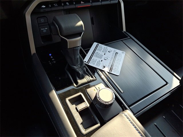 Here is a list of the vehicles features V6 Hybrid, 10-Speed Automatic, 4WD, 14 Speakers, 3rd row seats: split-bench, 4-Wheel Disc Brakes, ABS brakes, Air Conditioning, All-Weather Liners/Cargo Mat, Alloy wheels, AM/FM radio: SiriusXM, Anti-whiplash front head restraints, Apple CarPlay/Android Auto, Auto High-beam Headlights, Auto tilt-away steering wheel, Auto-dimming door mirrors, Auto-dimming Rear-View mirror, Automatic temperature control, Brake assist, Bumpers: body-color, Compass, Delay-off headlights, Driver door bin, Driver vanity mirror, Dual front impact airbags, Dual front side impact airbags, Electronic Stability Control, Emergency communication system: Safety Connect (10-year trial), Exterior Parking Camera Rear, Front anti-roll bar, Front Bucket Seats, Front Center Armrest w/Storage, Front dual zone A/C, Front fog lights, Front reading lights, Front wheel independent suspension, Fully automatic headlights, Garage door transmitter: HomeLink, Head Up Display (HUD), Headlight cleaning, Heated and Ventilated Front Seats, Heated door mirrors, Heated front seats, Heated rear seats, Heated steering wheel, Illuminated entry, Knee airbag, Leather steering wheel, Low tire pressure warning, Memory seat, Navigation system: Drive Connect (1 year trial) includes Cloud Navigation with real time traffic and Google POI, Occupant sensing airbag, Outside temperature display, Overhead airbag, Overhead console, Panic alarm, Passenger door bin, Passenger vanity mirror, Power door mirrors, Power driver seat, Power Liftgate, Power moonroof, Power passenger seat, Power steering, Power windows, Premium audio system: JBL, Premium Leather Seat Trim, Radio: 14" Toyota Audio Multimedia with JBL Premium Audio, Rain sensing wipers, Rear air conditioning, Rear reading lights, Rear seat center armrest, Rear window defroster, Rear window wiper, Reclining 3rd row seat, Remote keyless entry, Roof Cross Bars, Security system, Speed control, Speed-sensing steering, Split folding rear seat, Spoiler, Steering wheel mounted audio controls, Tachometer, Telescoping steering wheel, Tilt steering wheel, Traction control, TRD Cast Aluminum Running Board, Trip computer, Turn signal indicator mirrors, Variably intermittent wipers, Ventilated front seats, Ventilated rear seats, Voltmeter, and Wheels: 20" Machined-Finish Black Alloy TSRP is not the sales price and does not include taxes, tags, title, adjusted market value, dealer installed equipment (if applicable), and $490 dealer documentary fee.